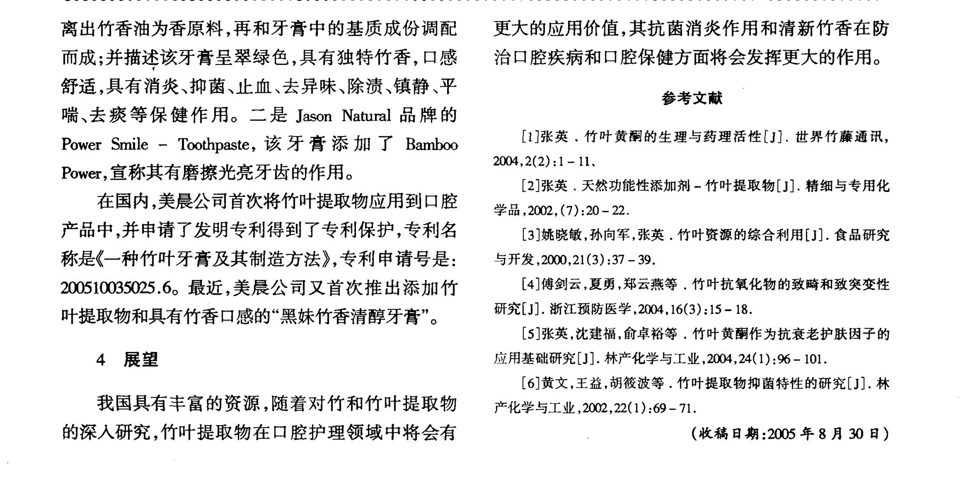 竹葉提取物在口腔護(hù)理領(lǐng)域中將會有更大的應(yīng)用價值,其抗菌消炎作用和清新竹香在防治口腔疾病和口腔保健方面將會發(fā)揮更大的作用。